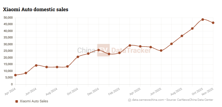 В ноябре Xiaomi поставила в Китае 46 249 автомобилей, что на 99,7% больше по сравнению с тем же месяцем прошлого года. Из них 33 729 составили кроссоверы YU7, а 12 520 — седаны SU7.